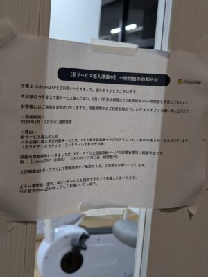 チョコザップ 額田店では上記の写真の張り紙にて6月~7月末の期間にて1週間程度の一時閉館を予定しているそうです。(カラオケ、ピラティス、ランドリーのいずれかが対象)