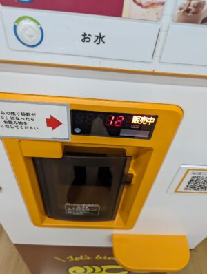このようにドリンクが出てきます。上記のランプのように販売中が点滅していたら。飲むことが出来ます。逆に点検ランプがついていたら飲むことが出来ません。