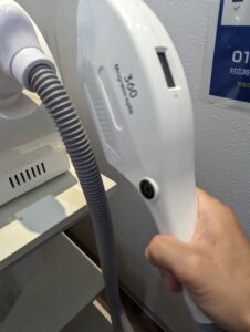 写真のブローブという機械を手に持ち、丸い照射ボタンを押してください。赤外線光が光りますが、サングラスをかけて注意してください。初見では結構びっくりしますので、